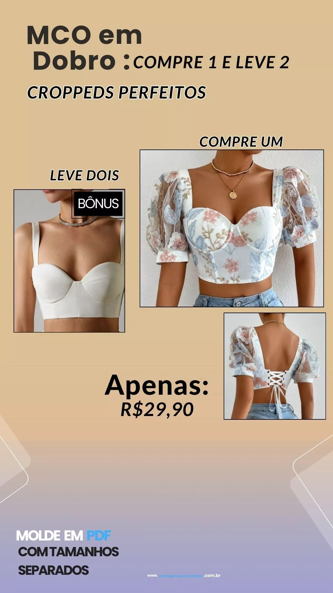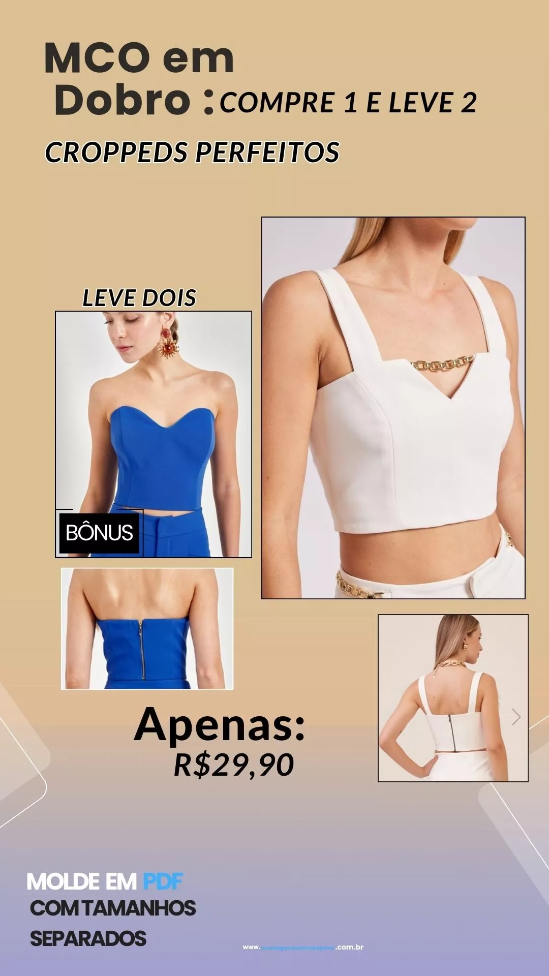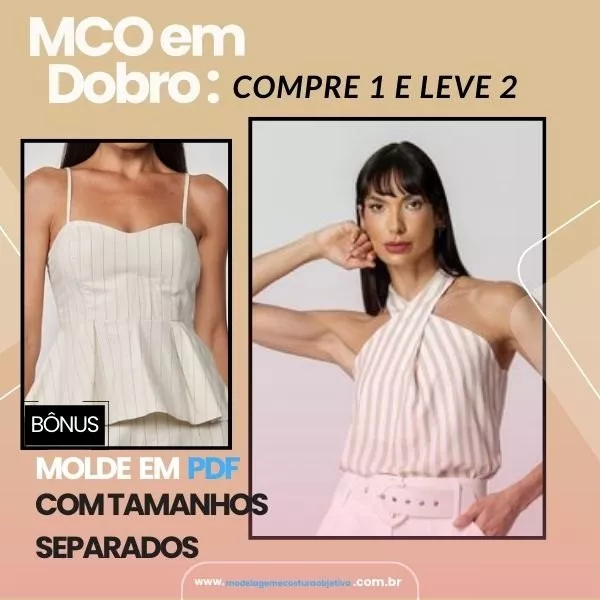 Molde de cropped de alça grossa detalhe em v e corrente + Bônus cropped tomara que caia.