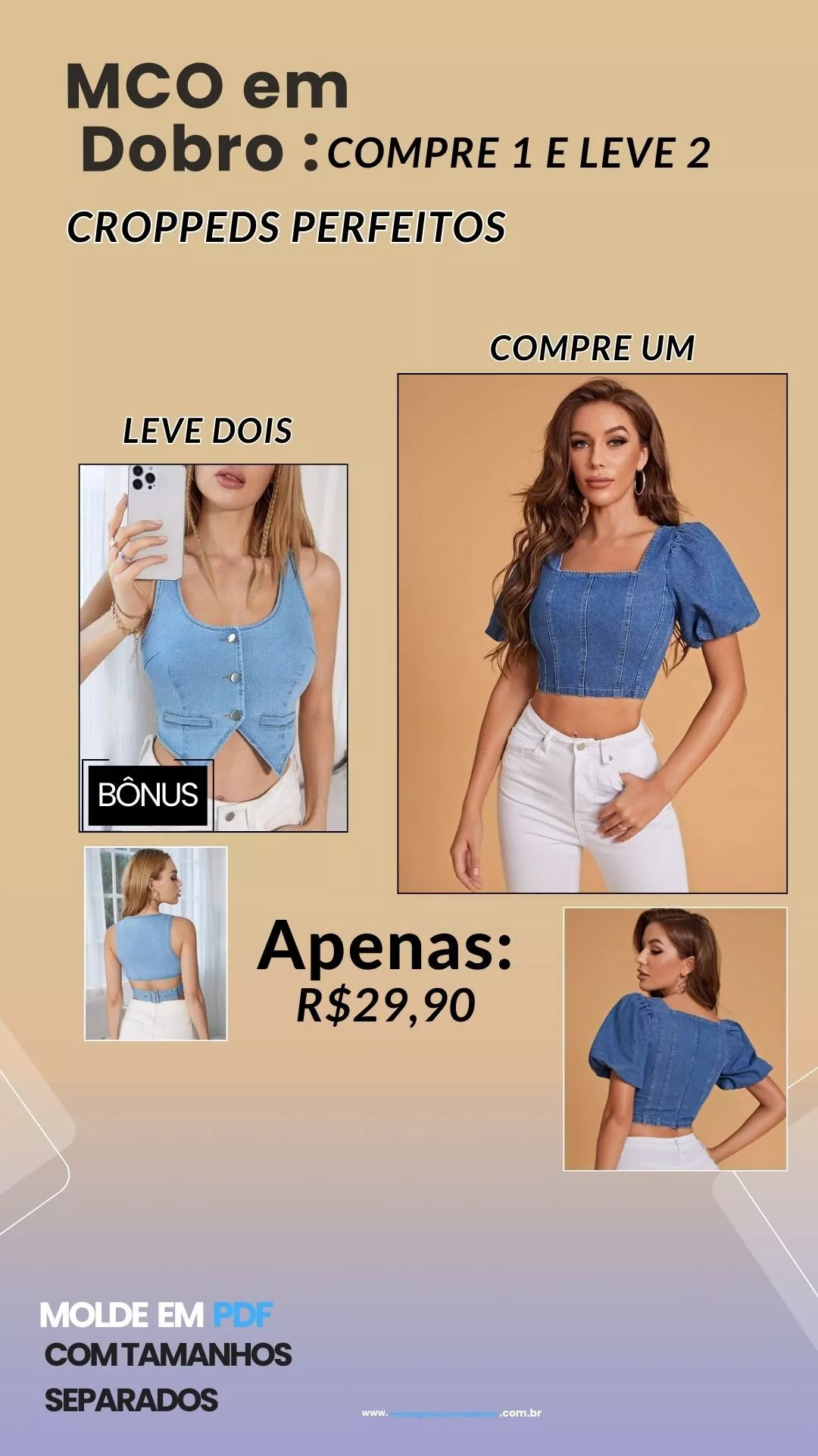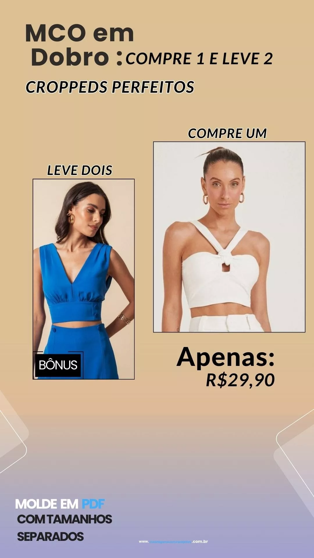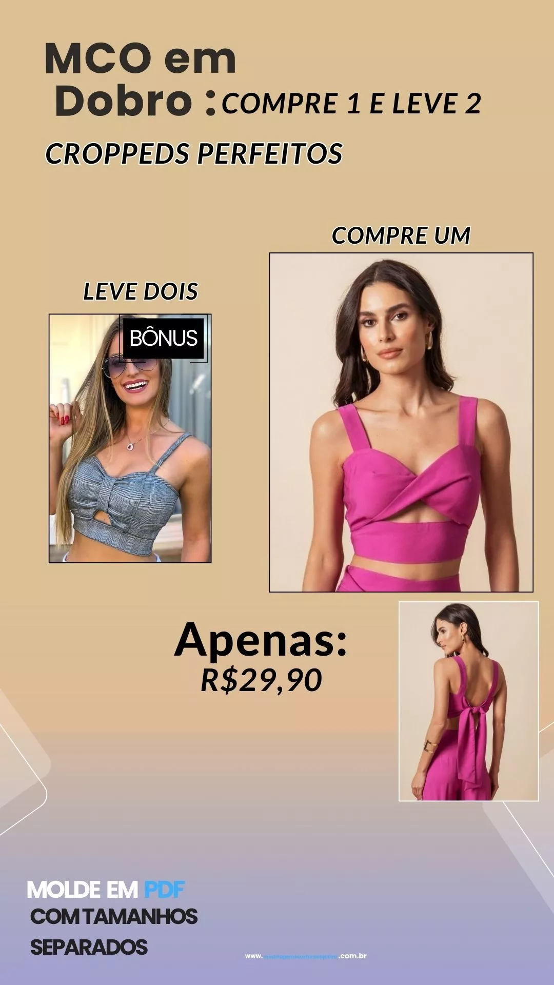 Molde de cropped de alça grossa detalhe em v e corrente + Bônus cropped tomara que caia.
