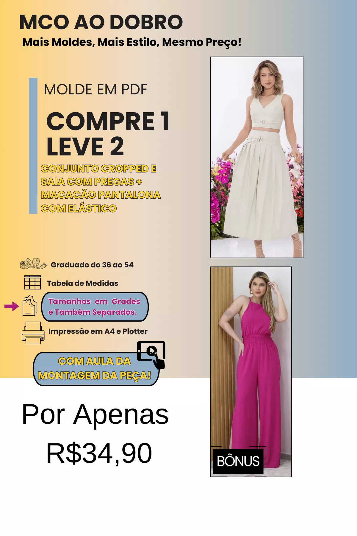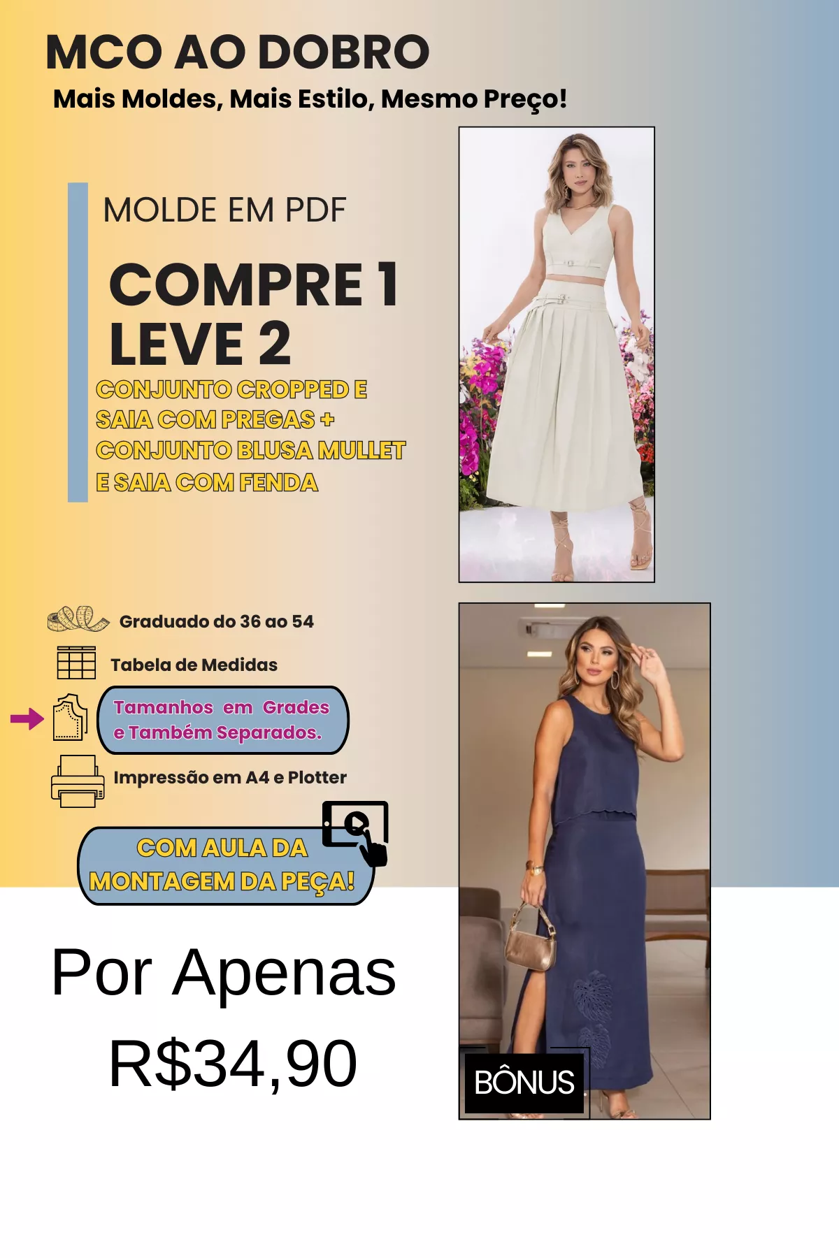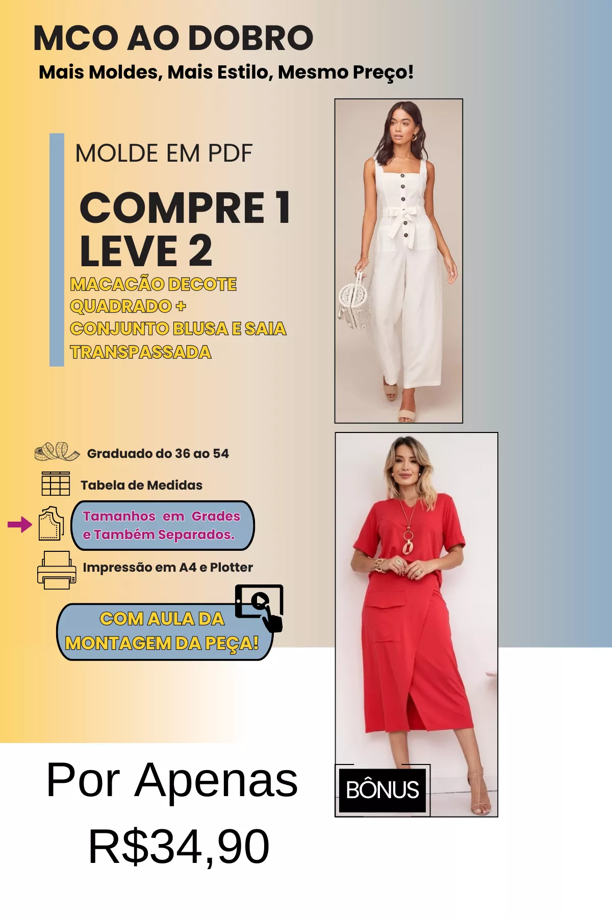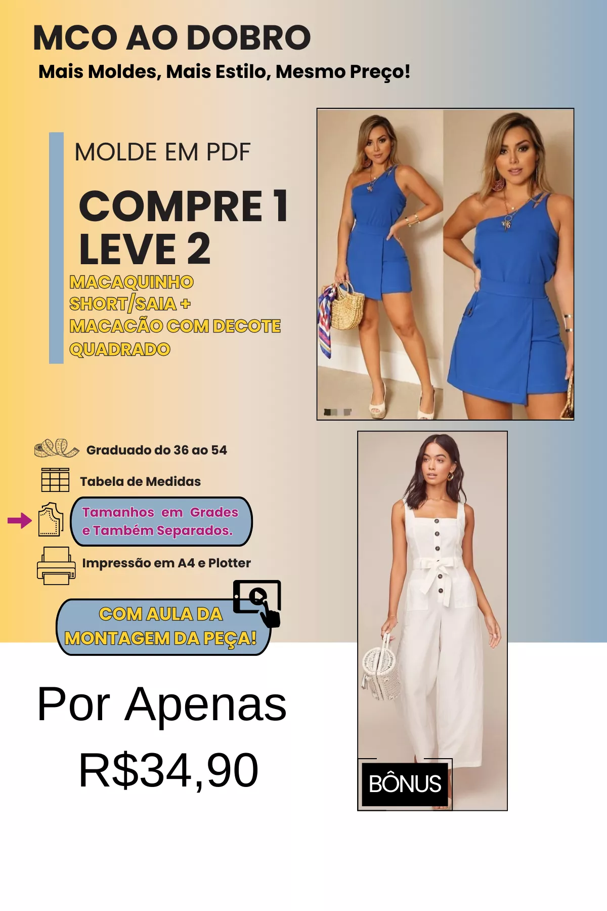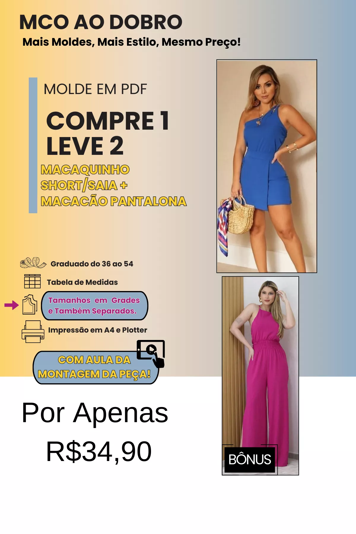 TODOS OS MOLDES SÃO GRADUADOS DO 36 AO 54, COM DUAS OPÇÕES DE IMPRESSÃO (A4 E PLOTTER) E TAMANHOS DISPONÍVEIS EM GRADES E TAMBÉM POR CADA TAMANHO SEPARADO.