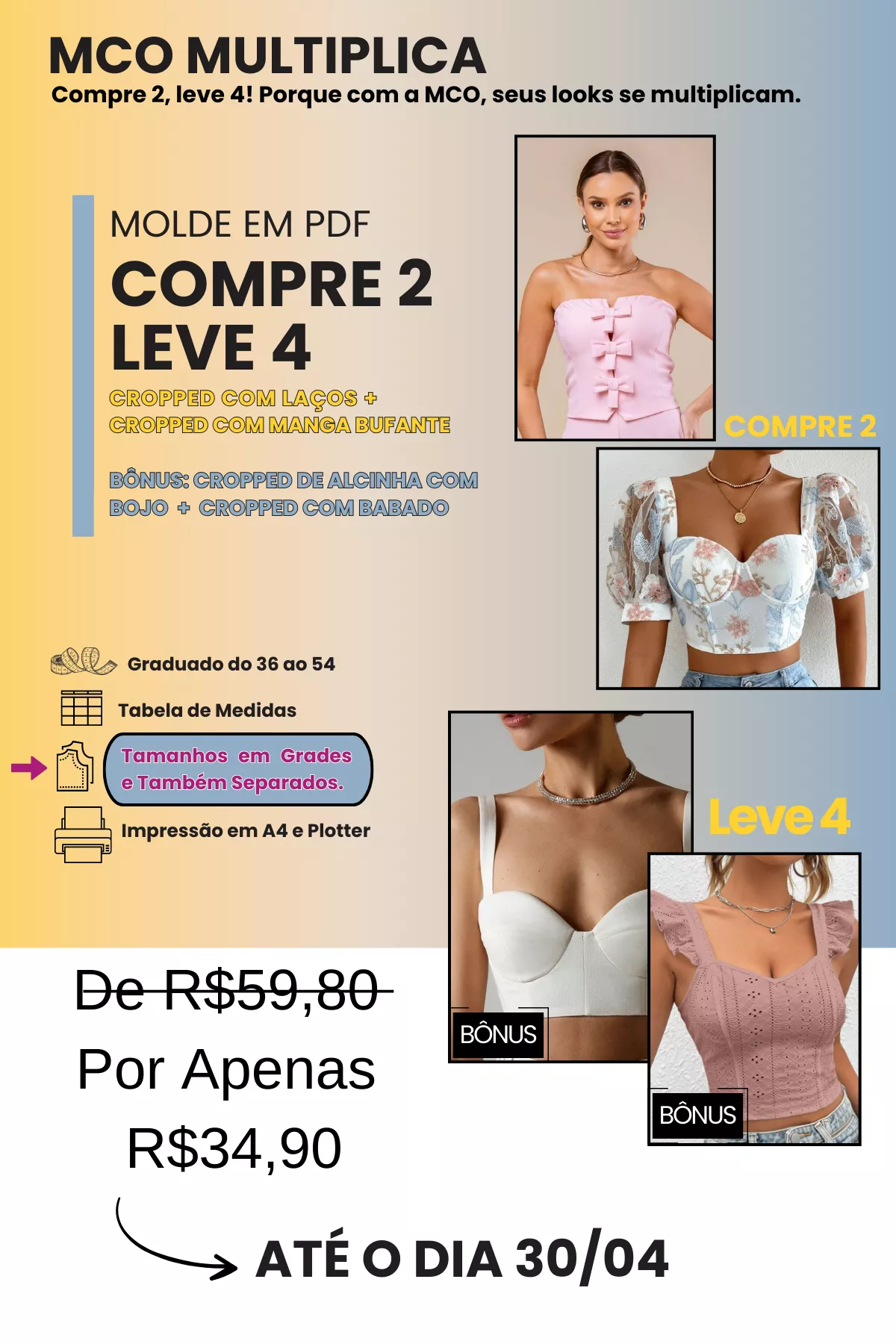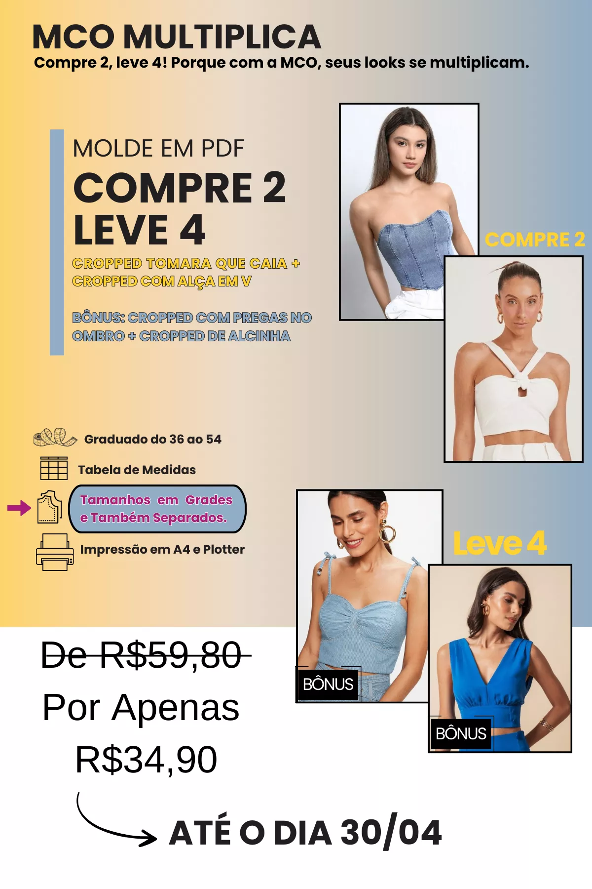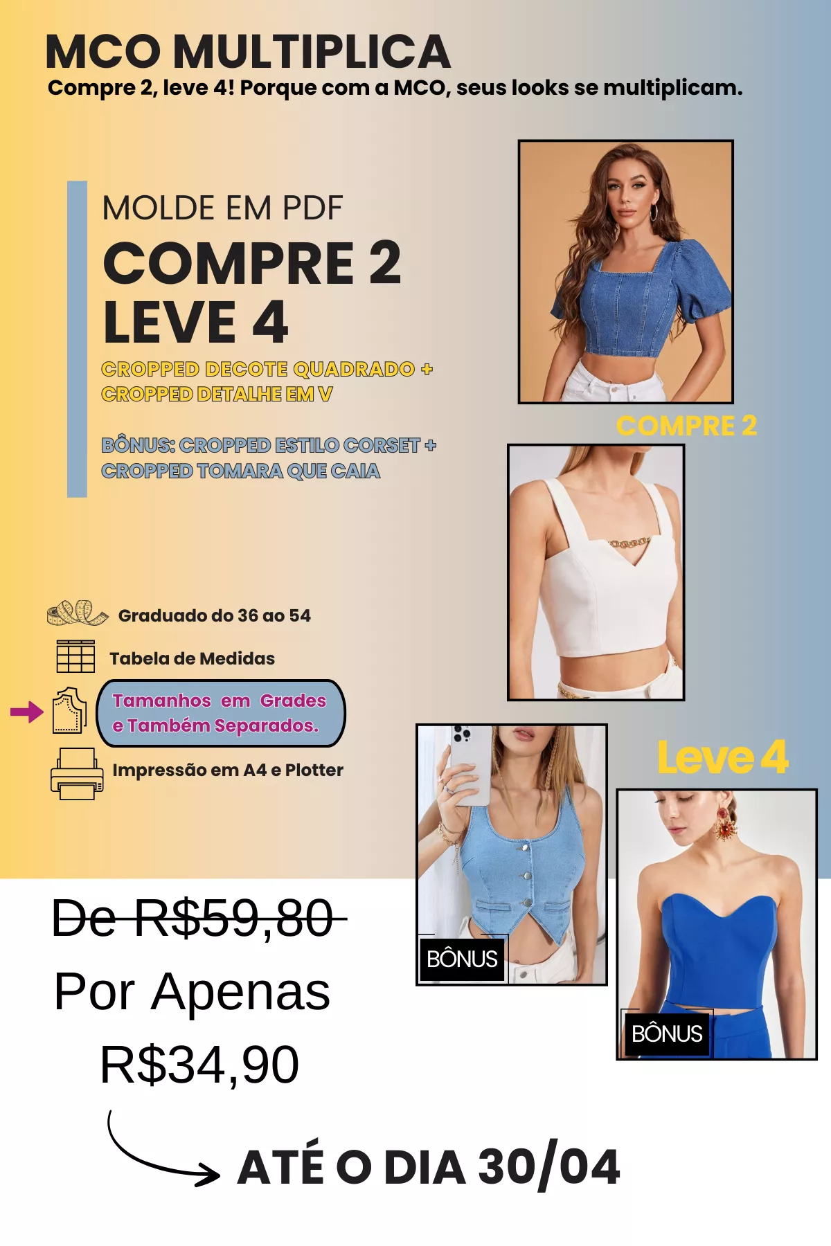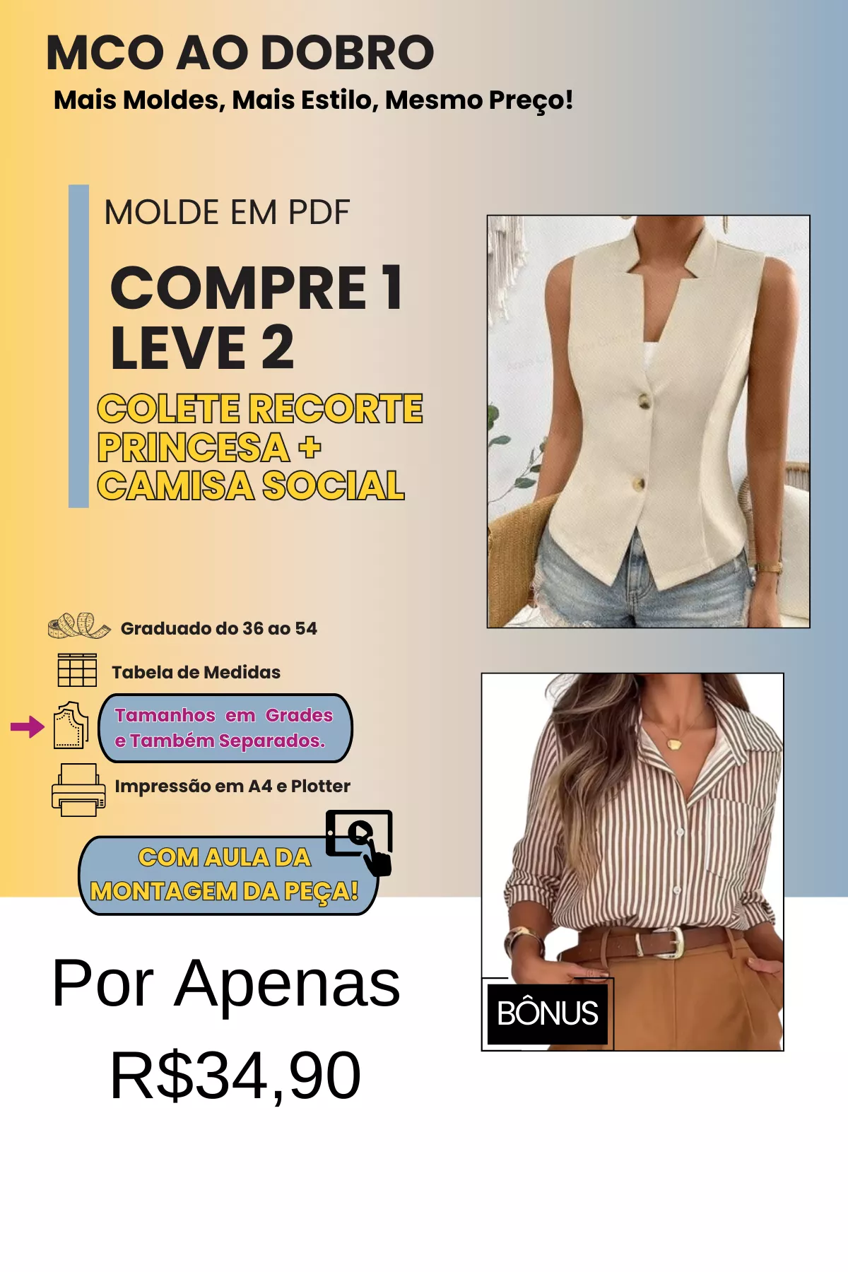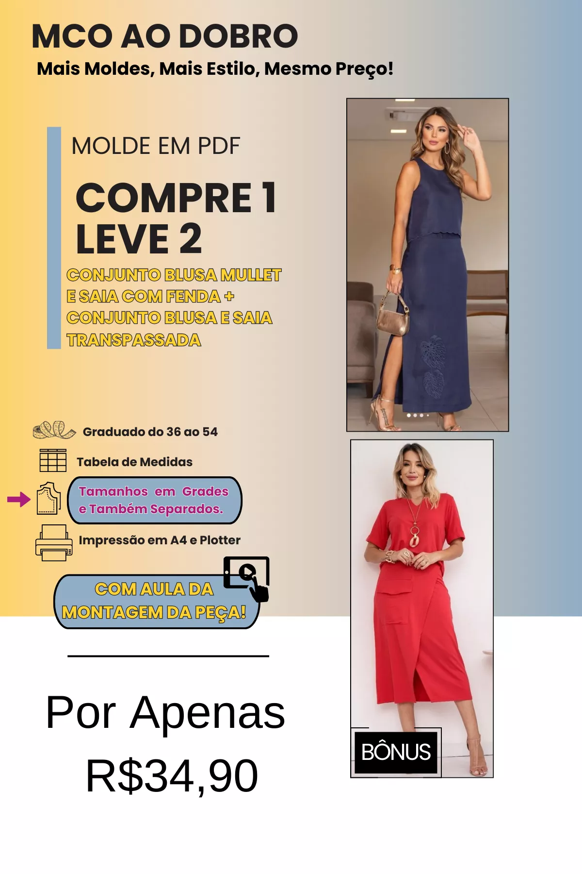 TODOS OS MOLDES SÃO GRADUADOS DO 36 AO 54, COM DUAS OPÇÕES DE IMPRESSÃO (A4 E PLOTTER) E TAMANHOS DISPONÍVEIS EM GRADES E TAMBÉM POR CADA TAMANHO SEPARADO.